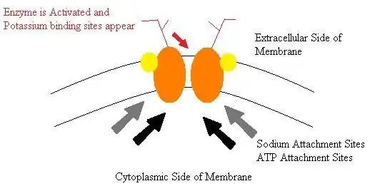 • ATP's 3rd phosphate (gamma phosphate) is removed from ATP and transferred to an aspartate residue. The shape of the channel changes and the sodium ions are released from the cell and at this time two potassium ions bind to a newly exposed site. The potassium causes the phosphate to transfer back onto ATP and the conformation is returned to its original state.