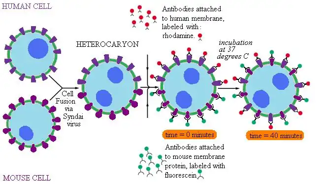 • It is possible to make a Heterokaryon cell with mouse and human cells. The human cell proteins can be visualized with antigens that are attached to a dye, FlTC which fluoresces yellow-green. Mouse cell proteins can also be marked with antigens tagged with rhodamine which fluoresces red.