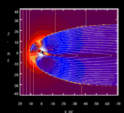 "The animation on the [right] shows how the magnetospheric field varies in response to the diurnal wobbling of the geodipole. The background color coding displays the distribution of the scalar difference DB between the total model magnetic field and that of the Earth's dipole alone. Yellow and red colors correspond to the negative values of DB (depressed field inside the ring current, in the dayside polar cusps, and in the plasma sheet of the magnetotail). Black and blue colors indicate a compressed field (in the subsolar region on the dayside and in the magnetotail lobes on the nightside)."[30]