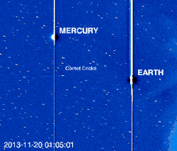 "The dark "clouds" coming from the right are density enhancements in the solar wind, causing all the ripples in comet Encke's tail. These kinds of solar wind interactions give us valuable information about solar wind conditions near the sun. Note: the STEREO-A spacecraft is currently located on the other side of the Sun, so it sees a totally different geometry to what we see from Earth."[38]