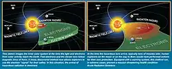 "Solar storms consist of electrons, protons and heavy ions, the last of which pose the gravest danger to space-borne electronics and to humans outside the Earth's protective magnetic field (such as on the Moon or en route to Mars). Electrons arrive first, signaling the later arrival of the ions. So far, however, there had been no adequate method to predict when these ions arrive. Sufficient advance warning allows for spacecraft to be put in a protective "safe mode" and humans to be instructed to seek shelter from the storm."[48]