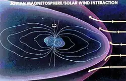 The diagram on the right shows the interactions between the solar wind and the jovian magnetosphere.