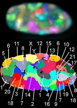 Karyotyping is a technique used to determine the (diploid) number of nuclear chromosomes of a eukaryotic organism, and may be used for determining sex and spotting chromosomal abnormalities. Cells can be locked part way through division (in metaphase) in vitro (in a reaction vial) with colchicine. These cells are then stained, photographed and arranged into a karyotype (an ordered set of chromosomes, Fig. 3), also called karyogram.
