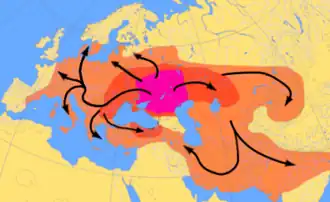 Map of Indo European migrations from ca. 4000 to 1000 BC according to the Kurgan hypothesis. The Anatolian migration (indicated with a dotted arrow) could have taken place either across the Caucasus or across the Balkans. The magenta area corresponds to the assumed Urheimat (Samara culture, Sredny Stog culture). The red area corresponds to the area that may have been settled by Indo-European-speaking peoples up to ca. 2500 BC, and the orange area by 1000 BC.