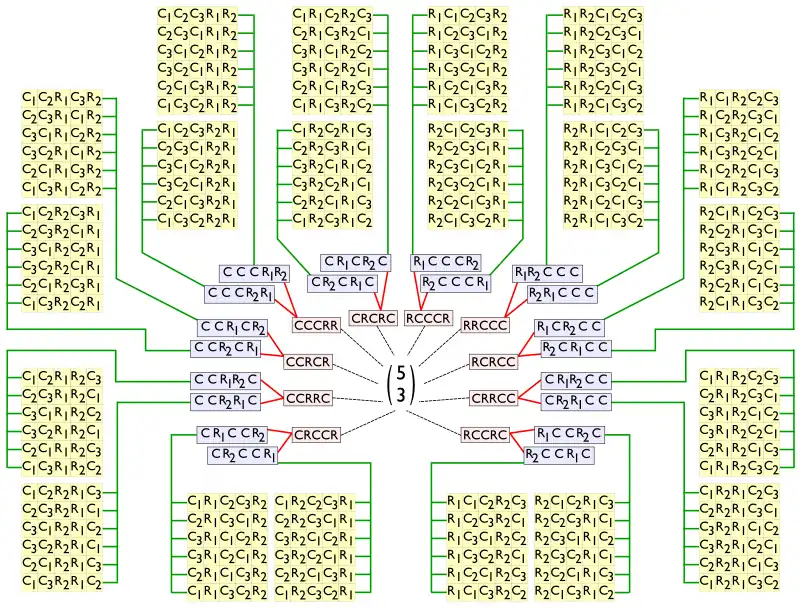 First circle. Begin at the center, with , which is the symbol for how many way three objects can be chosen from five distinguishable objects. The answer is obtained by counting the ten dotted lines leading from that symbol. The first circle documents all ten outcomes[1] associated with 5-chose-3.