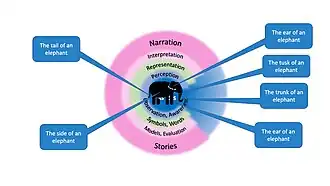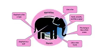 A group of blind men heard that a strange animal, called an elephant, had been brought to the town, but none of them were aware of its shape and form. Out of curiosity, they said: "We must inspect and know it by touch, of which we are capable". So, they sought it out, and when they found it they groped about it. In the case of the first person, whose hand landed on the trunk, said "This being is like a thick snake". For another one whose hand reached its ear, it seemed like a kind of fan. As for another person, whose hand was upon its leg, said, the elephant is a pillar like a tree-trunk. The blind man who placed his hand upon its side said, "elephant is a wall". Another who felt its tail, described it as a rope. The last felt its tusk, stating the elephant is that which is hard, smooth and like a spear.