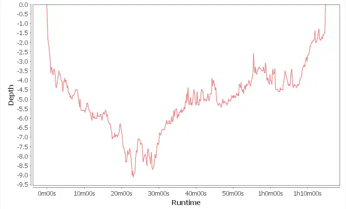 The dive computers were immersed in water inside the chamber and the profiles were run. Remaining no-decompression times, or required total decompression times, were recorded from each computer 1 min prior to departure from each depth in the profile. The results for a 40 msw “low risk” multi-level no-decompression dive from the PADI/DSAT RDP test series provided a range of 26 min of no-decompression time remaining to 15 min of required decompression time for the computers tested.