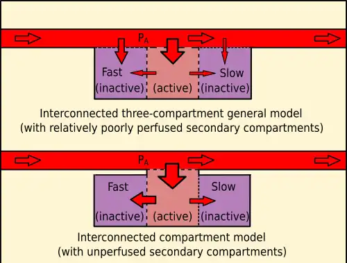 Early decompression models tended to use the dissolved phase models, and adjusted them by more or less arbitrary factors to reduce the risk of symptomatic bubble formation. Dissolved phase models are of two main groups. Parallel compartment models, where several compartments with varying rates of gas absorption (half time), are considered to exist independently of each other, and the limiting condition is controlled by the compartment which shows the worst case for a specific exposure profile. These compartments represent conceptual tissues and are not intended to represent specific organic tissues, merely to represent the range of possibilities for the organic tissues. The second group uses serial compartments, where gas is assumed to diffuse through one compartment before it reaches the next. A recent variation on the serial compartment model is the Goldman interconnected compartment model (ICM).