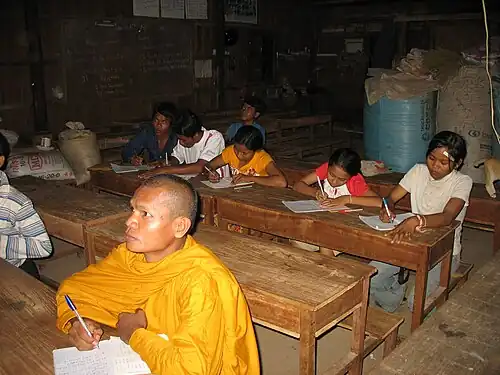 According to a report by the Center for Economic and Social Rights, although Cambodia has experienced a steady rise in GDP per capita since 1993 and a rapid decline in poverty (though this has slowed "since the 1998 elections") efforts to stymie social inequality and economic stratification within the country by the government have been wholly inadequate.[354] The report cites the fact that the Cambodian government's rate of social expenditure stands at a meager "3.5 percent of GDP, the smallest of all low-income countries".[355] Cambodia's population is predominately rural, standing somewhere around 80% (95% by some estimates) while only approximately 19% of Cambodia's citizens live in urban areas (9% of which are situated within Phnom Penh), yet only 16% of "the poorest Cambodians" own land while there are increasing tax burdens placed on the poor to make-up for revenue lost through exports.[356][357] About 92% (3.7 million) of all poor persons in Cambodia live in rural areas with only 19% of rural dwellers having access to adequate sanitation facilities and only 10-20% of citizens living in three of Cambodians predominately rural provinces having access to safe drinking water.[358][359] Disparities in education is marked not only by rural versus urban residences but also by gender; while 43% of men in Cambodia enroll in secondary school only 34% of women do the same.[360] State expenditure in the education sector has fallen in-between 2001 and 2004 from seven percent of GDP to 5.6%.[361] These inadequacies between rural and urban development seems to follow the development initiatives of the government; road infrastructure development is highly skewed toward urban areas along with garbage collection, electricity, health care and safety conditions (landmine clearing initiatives).[362][363] While the government continues to grant major subsidies to its military the everyday living conditions of rural and urban inhabitants alike remains inadequate.