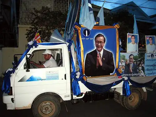 These communes represent more localized and decentralized (and thus, some may say, more directly democratic) political representation within the Cambodian governmental and political structure. But although Cambodia has made strides in representation of citizens in the political process, stability in government, and a move away from genocide and outright warfare, the country and its citizens still suffer from a political establishment with a propensity for corruption, murder, and dissident suppression.[131][132] The current Prime Minister Hun Sen, who has held his post for over twenty years, is a former member of the Khmer Rouge and long time establishment figure.[133] In 1993 Sun's party, the CPP, was forced to form a coalition government with FUNCINPEC upon lacking a clear majority in parliamentary elections. In 1997 Sun and his supporters wrestled control from his "co-prime minister in a bloody coup", ousting FUNCINPEC leader Prince Ranariddh.[134] Currently Sun and the CPP are rumored to maintain effective control of the majority of state institutions, including "he king, the Constitutional Council, the National Assembly and the judiciary".[135] Under the circumstances political dissidents within and outside of the establishment suffer at the hands of ruing elites. Chea Vichea, an "influential Cambodian trade-union leader who fought for increased wages and improved working conditions" was killed on the morning of 22 January, 2004.[136] With the two men charged and sentenced for the murder being released from jail by the Cambodian Supreme Court and a documentary on the political figure and his murder being banned from screening within Cambodia, blame seems to reside with the government.[137] In addition to the suppression of labor organizers, political parties are also suspect to targeting by government authorities. The Sam Rainsy party is a political organization within Cambodia that has taken a line against the establishment under the leadership of Sam Rainsy, a noted opposition leader within the Parliament.[138] Rainsy was convicted in September of 2010 of "spreading disinformation and falsifying maps".[139] Rainsy's trial was closed to the public and was missing Rainsy's presence due to his "self-imposed exile".[140] Although Mr. Rainsy does not currently reside in Cambodia upon his return he will face immediate imprisonment if he returns.[141] Human Rights Watch has stated that the trial and its verdict (along with various assassination attempts upon Mr. Rainsy's life) have shattered "even the pretense of democracy" in Cambodia.[142] It is hard to predict where the government of Cambodia is heading next if these nefarious activities continue to be carried out by the government. The United States Senate proposed a bill in 2003 that would "grant Cambodia a further $21.5m in aid if Hun Sen was not re-elected" and Human Rights Watch urged multiple international governments that provide assistance to Cambodia ("Donors contribute approximately 50 percent of the Cambodian government's budget") to "take strong diplomatic action in response to the sentence against Rainsy, including recalling their ambassadors to demonstrate their outrage".[143]