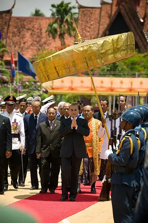 The rights of the Cambodian citizenry is enshrined in the country's constitution. The constitution grants citizens the full protection of human rights outlined in the United Nations Charter and the Universal Declaration of Human Rights.[323] Khmer citizens are extended equal privilege before the law "regardless of race, colour, sex, language, religious belief, political tendency, birth origin, social status, wealth or other status".[324] Both sexes therefore enjoy the right to vote, enjoy access to "right to participated actively in the political , economic, social and cultural life of the nation", "choose any employment according to their ability and to the needs of the society", and "receive equal pay for equal work".[325] Also protected is the right of citizens to peacefully strike, private property rights, denounce, make complaints or file claims against any breach of the law by the State, and freedom of expression, press, publication and assembly; among others.[326] As has been cited in the previous sections, the rights enumerated and granted to Cambodian citizens are a different reality on paper than they are in practical terms. In a 2011 world report Human Rights Watch reported that "The Cambodian government increased its repression of freedoms of expression, assembly, and association in 2010, tightening the space for civil society to operate".[327] Specifically cited in the report was the extent to which Hun Sen and the CPP has consolidated its control over Cambodian institutions ("judiciary, new laws") in an effort to enforce its mandate through illegitimate coercion.[328] The report cited efforts by the CPP to "legal action to restrict free speech, jail government critics, disperse workers and farmers peacefully protesting, and silence opposition party members".[329] As of 2010, Cambodia was failing to live up to the stipulations of the 1951 Refugee Convention, have suppressed dissent through a new penal code that classifies speech critical of government as defamation and disinformation, the killing of ten opposition journalists in the last fifteen years, restrictions on freedom of association through "pending legislation" concerning the actions of N.G.O.'s and trade unions, violent quashing of public and popular protests, the use of the judiciary to target opposition members in court, 2,000 people "arbitrarily detained" for reported drug use, targeted violence towards sex-workers and women in general, and the list goes on and on.[330]