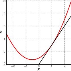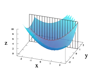 To find the slope of the line tangent to the function at and parallel to the -plane, we treat as a constant. The graph and this plane are shown on the right. Below, we see how the function looks on the plane . By finding the derivative of the equation while assuming that is a constant, we find that the slope of at the point is: