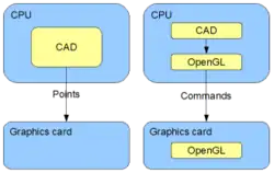OpenGL significantly improves the quality and speed of 3D model visualization, allowing the separate Graphics Processing Unit (GPU) to handle graphics rendering and freeing up Central Processing Unit (CPU) capacity, which improves CAD performance and usability. OpenGL interface offers many ready to use functions that speed up CAD development. OpenGL is supported by OS (operating system) such as Windows or Unix. CAD so first call OS function, which is performed by OS or propagated to GPU using driver. Functions and complex calculation are so preferably done by fast and optimized GPU or, if required function is not supported by graphics card GPU, then software emulation is used and calculation is done by CPU. Modern graphic cards are in fact powerful computers that process commands. That is why they are expensive and power hungry. You should be aware of GPU role while it can dramatically improve CAD performance. When using particular CAD, graphics card features (especially supported standards) should be in concordance.
