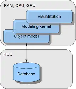 Data is read from the hard disk into memory RAM as an object model. Each graphical element is represented as an object. Changes are made by manipulating these objects in RAM. And then stored in the database on permanent storage such as the hard disk.