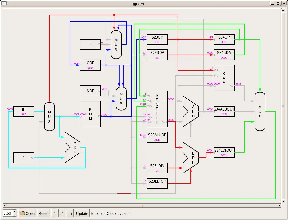 If you have not by now, please take a look at the picture in the gpsim section to get an overview. The line colors are showing from which stage the signals are coming (Cyan, Bue, Red, Green).