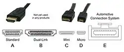 - HDMI (High-Definition Multimedia Interface) is a proprietary audio/video interface for transferring uncompressed video data and compressed or uncompressed digital audio data from an HDMI-compliant source device, such as a display controller, to a compatible computer monitor, video projector, digital television, or digital audio device. HDMI is a digital replacement for analog video standards. The maximum pixel clock rate for HDMI 1.0 was 165 MHz, which was sufficient to allow 1080p and WUXGA (1920×1200) at 60 Hz. HDMI 1.3 increased that to 340 MHz, which allows for higher resolution (such as WQXGA, 2560×1600) across a single digital link. There are five HDMI connector types. Type A/B are defined in the HDMI 1.0 specification, type C is defined in the HDMI 1.3 specification, and type D/E are defined in the HDMI 1.4 specification.[5]