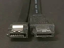 - Standardized in 2004, eSATA (e standing for external) provides a variant of SATA meant for external connectivity. It uses a more robust connector, longer shielded cables, and stricter (but backward-compatible) electrical standards.[4]