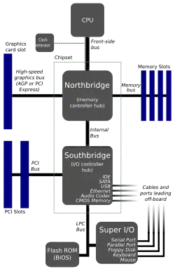 - Front-side buses usually connect the CPU and the rest of the hardware via a chipset, which Intel implemented as a northbridge and a southbridge. Other buses like the Peripheral Component Interconnect (PCI), Accelerated Graphics Port (AGP), and memory buses all connect to the chipset in order for data to flow between the connected devices. These secondary system buses usually run at speeds derived from the front-side bus clock, but are not necessarily synchronized to it.[14]