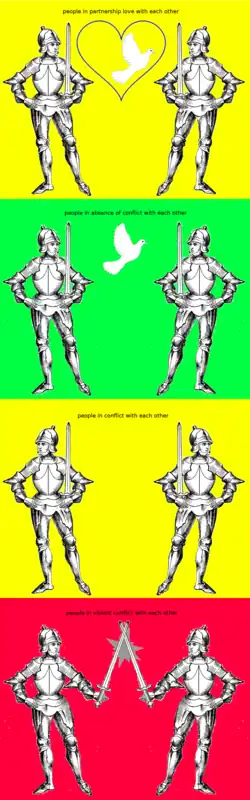 As a rule of thumb, relationships we engage in are often too radical.[1] The image on the right shows that there are many types of relationships we can engage in; i.e., not only by either being very friendly or violent towards each other, but also to simply refrain from any interaction with the other group at all. This last type of relationship seems the best option in times/locations where/when tension is high.
