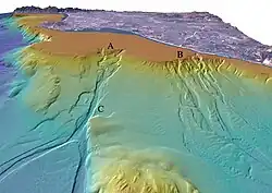 {{free media}}"Perspective view looking north over the San Gabriel (A) and Newport (B) submarine canyons. The distance across the bottom of the image is about 17 km with a vertical exaggeration of 6x. Both canyons formed when the San Gabriel River and the Santa Ana River flowed out across the Los Angeles Basin and offshore shelf when it was exposed during lower eustatic sea level. Newport Canyon begins less than 360 m from shore at the north end of Newport Harbor and is composed of individual channels that braid down the slope over a width of about 9 km. San Gabriel Canyon begins as a series of channels that join together midway down the slope and then split into two channels at the base of the slope. The width of San Gabriel Canyon at "C" is 815 m and incises about 25 m into the slope. Lasuen Knoll can be seen in the forground."[5]