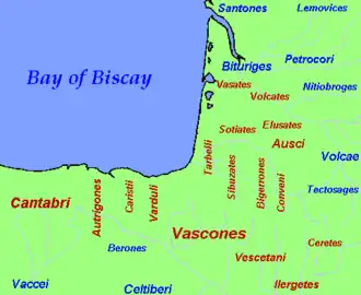 Across the border in what is now France, the Aquitani tribes of Gascony spoke a language different from the Celts and were more like the Iberi.[45] Although no complete inscription in their language survives, a number of personal names were recorded in Latin inscriptions, which attest to Aquitanian being the precursor of modern Basque[46] (this extinct Aquitanian language should not be confused with Occitan, a Romance language spoken in Aquitaine since the beginning of the Middle Ages).