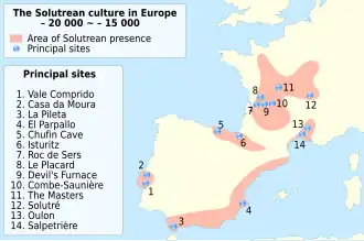 Location map of Homo Sapiens is during Solutrean culture, between 22,000 ~ 17,000 BP. Credit: Sémhur & MPants at work.{{free media}}