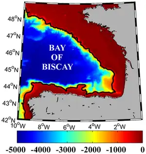 As can be seen in the image on the right, most of the continental shelf of the Bay of Biscay is less than 300 m in depth. "The isobath corresponds to -1000 m."[12]