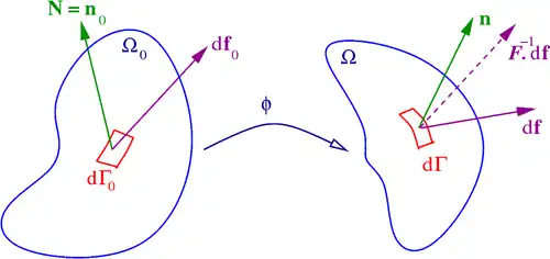 The following definitions use the information in the figure. In the reference configuration , the outward normal to a surface element is and the traction acting on that surface is leading to a force vector . In the deformed configuration , the surface element changes to with outward normal and traction vector leading to a force . Note that this surface can either be a hypothetical cut inside the body or an actual surface.