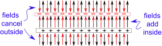Newton's laws assume that the net force is the sum of all forces, ma=ΣFj (sum over j). Since the electric field, E, is defined through Coulomb's law via F=qE, the simplest possible assumption is that the electric field is the sum of the individual electric fields due to each charge. This is principle is called superposition (or linear superposition) and it holds at least down to the sizes smaller than the atomic nucleus. In fact, we have implicitly assumed superposition by integrating to obtain the electric field due to line and surface charges. As shown in the figure, the electric fields add constructively in the space between the plates. They add destructively (i.e. they subtract) outside the two plates and add to zero electric field. Therefore the electric field between the plates is