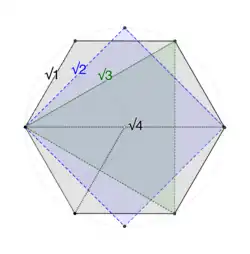 - ↑ 11.0 11.1 11.2 11.3 11.4 These triangles lie in the same orthogonal planes containing the hexagons;[i] two triangles of edge length √3 are inscribed in each hexagon. For example: