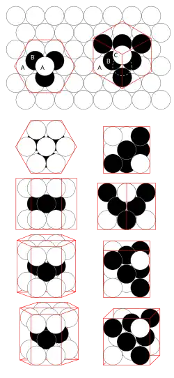 - ↑ Starting at any vertex, find one of the 4 √3 triangular face planes[m] centered 1/2 edge-length below it and slice through those 3 vertices, removing the starting vertex and 4 of its 8 nearest neighbors and exposing a √3 triangular face. Repeat for the other three sides of the tetrahedron.
