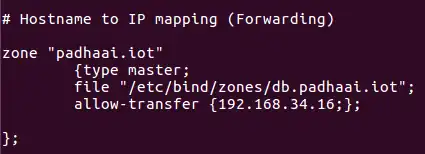 sudo named-checkzone db.padhaai.iot /etc/bind/zones/db.padhaai.iot: to check the forward zone configuration file