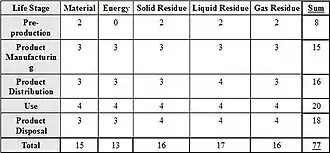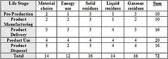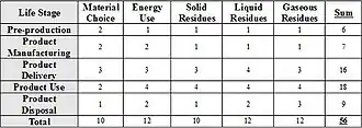 Streamlined Life Cycle Assessment: The qualitative streamlined LCA used to analyze the non-rechargeable battery powered flashlights provided the following results: Overall matrix rating was calculated as 56. Low matrix ratings were given at pre-production and production stages for solid, liquid and gaseous residues, at usage stage for material selection and at disposal stage for solid residues. High matrix ratings were awarded at batteries transportation stage for liquid residues and at usage stage for energy use, solid, liquid and gaseous residues.