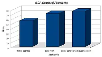 Streamlined Life Cycle Assessment: The qualitative streamlined LCA[13] used to analyze the non-rechargeable battery powered flashlights provided the following results: The linear generator with supercapacitor alternative has received a streamlined LCA score of 77. All categories given score of four during the entire usage stage of the linear generator because no material is emitted and negligible energy is consumed by the user’s hand. The supercapacitor uses a relatively large amount of activated charcoal compared to its total size. The production of activated charcoal consists firstly of mining the coal, followed by carbonization and oxidation of the coal at very high temperature. This is done to create the large porosity of the material that results in the high energy storage density of the material. This is an energy intensive process. Thus, lows scores are given for the pre-production section.