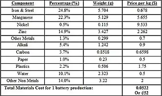- ↑ Proportion of Materials Inside a Single Battery. [Accessed: March 2009] Website: http://web.archive.org/web/20061209124033/http://www.defra.gov.uk/environment/waste/topics/batteries/pdf/erm-lcareport0610.pdf
