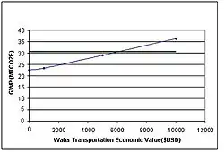The sensitivity analysis measures the effect of increased transportation costs on the GWP, and to find a maximum economic value to match the GWP of bagasse to the other alternatives. The results are illustrated in the figure to the right. The chart concludes that for a total economic value less than roughly $6000 into the transportation sector, bagasse will still have less GWP emissions than the baseline polystyrene. In order to transport 1 million cups by cargo ship from China to the United States, the price of a 8 ft x 8 ft x 20 ft container costs on average $1856[25] ($2005). Using the dimensions of the 4 oz cups at Worldcentric, roughly 430000 cups can fit in one bin.