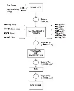 The EIOLCA sector used for the manufacturing life stage is ‘All other converted paper product manufacturing'. Outlined in the figure to the right is detailed information regarding the inputs to a bagasse cup manufacturing facility in China [21]. Scaled to the production of one million cups at 4 g/unit, the required electricity in the factory is 38764.84 kWh. By using the linearity of the EIOLCA model to set the electricity used, it was clear the sector does not represent the manufacturing of bagasse cups from pulp very well. The Motor Gas used in the sector was lower by a factor of 7.87 and the Natural gas was higher by a factor of 1.45 compared to the data given by Worldcentric. The following Hybrid-LCA was performed: The cost of one 4 oz. bagasse cup was averaged from sources [4][22][23] to be $0.04/cup. With an estimated 10% mark-up value for 1 million cups, the total cost in 1997 $USD is $27294.24. This total cost was used as an input into a hybrid version of the ‘All other converted paper product manufacturing’ sector which eliminates paper-specific and harvesting processes such as Logging and Sawmills in order to simulate the conditions for resource extraction. The following table provides a summary of inputs for the EIOLCA: