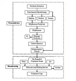For the purpose of this study, the premanufacture and manufacturing phases of the life-cycle are organized as shown in the flow chart at right. End-of-life assumes that 100% of the EPS cups end up in land fills. While EPS is theoretically recyclable, in practice it is rarely accomplished [8].