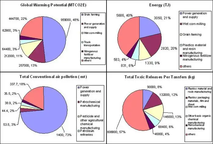 Each bag produces $0.11 US (1997) of economic activity, 33% of which is in the resin manufacturing, film packaging and wet corn milling sectors. This was found for an economic input of $213 million USD (1997) for the current Canadian demand of 6 billion bags per year. The energy intensive sectors - power generation and supply (21% GWP, 22% Energy) and agriculture (grain farming 15% GWP and wet corn milling 9% GWP, 16% Energy) - are the largest sources of greenhouse gas CO2 emissions due to the raw resources extraction required in both processes.