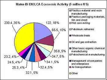 Sensitivity analysis of the results showed that a 25% increase in cornstarch content in Mater-Bi would lead to 8.1% increase in global warming potential and 5.2% increase in energy from agriculture activities. The true production cost was not released by Novamont and variation in estimated values is in direct relation to the environmental impact found using the EIOLCA.