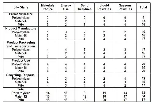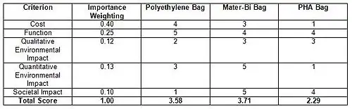 The largest difference between the two proposed alternatives, Mater-Bi and PHA, and the baseline conventional product, polyethylene, is in their relative qualitative environmental impacts. As seen from the streamlined assessments of each alternative, the use phase involves no environmental impact. This is because the use phase of a grocery bag is considered to be very short, and involves no inputs or outputs from the bag itself. The largest discrepancies between the SLCA scores of each alternative are found with the Premanufacture and the Recycling and Disposal stages, with the discrepancies found primarily between the proposed alternatives and the baseline alternative. In the premanufacturing stage, it is clear that the use of fossil fuels and their higher greenhouse gas emissions contributed to the low score for polyethylene, and the higher dependence on the agricultural sector and its renewable products contributed to the higher scores for both PHA and Mater-Bi. This is despite the additional impact brought about by the transportation of Mater-Bi supplies overseas from Europe. Similarly, the biodegradable nature of the proposed alternatives gave both Mater-Bi and PHA the higher scores in the Recycling and Disposal life stage, as the polyethylene bags are known to take numerous years to decompose into its elemental components, whereas the alternative bags take less than one year to biodegrade itself in a compost environment.