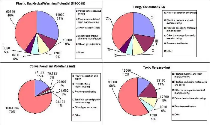 The total value of economic activities in the plastic packaging material, film and plastic resin manufacturing represented more than half of the total economic activity. In addition, the total value of economic activities as a result of manufacturing the polyethylene bag is 250% of its retail value. Toxic releases are evenly distributed throughout the life cycle of the bag. There is a total of 158,000 kilograms of toxics released throughout the life cycle of 6 billion bags. Over half of these toxic substances are released into land and underground. Twenty-five percent of all toxic releases are produced during the manufacturing process of plastic resin and films. The majority of all sulfur dioxide (SO2) released is from power generation, as coal is assumed to be the primary source for power generation. Moreover, a total of 1320 metric tons of carbon monoxide (CO) and 307 metric tons of nitrogen oxides (NOx) is released from various sectors throughout the life cycle of plastic bag. Aside from the plastic resin manufacturing process, energy consumption is evenly distributed amongst the other sectors. However, the manufacturing process of plastic resin is energy intensive, and thus, this sector consumes relatively more energy than the other sectors combined. The amount of energy required to produce 6 billions plastic bags is 1910 terajoules. Finally, the global warming potential for annual Canadian plastic bag consumption is estimated at 146,000 metric tons of equivalent carbon dioxide (CO2).