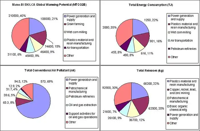 Transportation of Mater-Bi pellets overseas from Italy to Canada also has significant environmental impact (6% GWP, 8% Energy) due to the amount of fuel required for freight air transportation. The premanufacturing of the Mater-Bi pellet in the custom plastic material and resin manufacturing sector is the second most energy intensive process requiring 901 terajoules, or 16% of the overall total, and has the highest amount of toxic air, water and land releases at 66,200 kilograms.