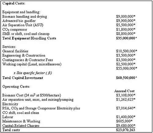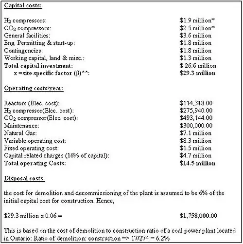 Since the reactors utilize artificial light to grow algae, these materials are costly and increase the total cost of the reactor [18]. It was assumed that the pond is 2.5 cm deep with a concentration of 0.2 g/L of algae [19]. The bio-reactor cost chosen was $10/m2 and is a good estimate as it is based on a reliable supply of 300kg/day per reactor [19]. Changing any of these factors may significantly affect the analysis and thus the selling price of hydrogen [19]. These numbers are based on $2004.The operating costs for the process involve factors such as electricity, maintenance, pond area, operating (PSA) costs, equipment costs (compressors), and labour. The costs associated with the demolition of the plant and its equipment is assumed to be 6% of the initial capital investment for construction. Hence, 60.5 million dollars x 0.06 = $3,630,000 This is based on the cost of demolition to construction ratio of a coal power plant located in Ontario: Ratio of demolition: construction = 17/274 = 6.2% [20]
