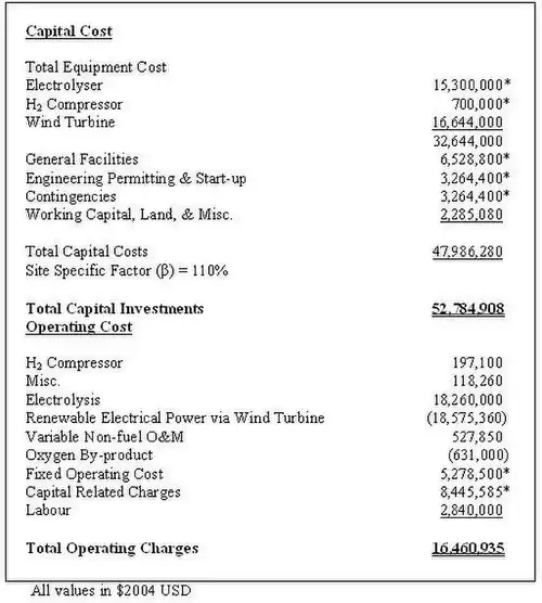 The total cost of power by the compressor, electrolysis, and other systems will be offset by the cost savings of renewable energy gained by the wind turbines. The remaining costs are based on fixed operating, capital related charges, and labor for the electrolysers and wind turbines. The total operating costs are approximated to be $16,460,935 /year. The estimated cost for hydrogen per kilogram is $2.70.