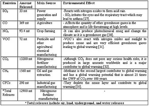 The EIOLCA analysis shows that most emissions are from the all other crop farming sector. During resource provisioning, there are no solid, liquid, or gaseous residue. A significant amount of releases are produced during process implementation due to construction of the plant and equipment. Construction and demolition produces a considerable amount of inhalable particulates (EIOLCA - 58.2 metric tonnes) that pose serious health risks to humans[22]. Burning fossil fuels such as diesel for shipping and construction vehicles also produces hazardous gaseous emissions such as carbon monoxide (369 mt)[23]. During the primary and secondary processes, dead algal biomass can be reused as fertilizer or as an input to other competitive processes [24]. Chemicals such as nitrogen oxides (93.4 mt) and sulphur dioxides (33 mt) are released during algae farming [19]. A large amount of carbon dioxide (13200 mt) is emitted into the atmosphere when the dead algal biomass is processed or used as an input to other processes (ie; combustion of biomass)[19].