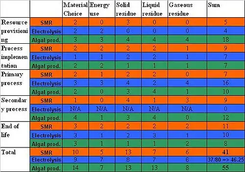 From this qualitative analysis of Steam Methane reforming it is shown that resource provisioning has the lowest score from the life stages and thus the largest environmental impact, this is due to the necessary mining and refining the metals used in the generation of hydrogen . Toxic residues from mining of nickel and alumina needed for catalysts form acidic mine drainage and toxic fume releases. Energy use appears to have one of the largest environmental effects according to the Streamlined LCA, this can be said to be due to the large energy intensity of all the processes involved in the SMR lifecycle. The secondary process in the generation of hydrogen through this method is carbon dioxide sequestering, this procedure reduces the total CO2 emissions for steam methane reforming and thus lessens the major air pollutant from the SMR process.
