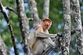 Brunei’s tropical rainforest contains rare species. The proboscis monkey, found only on the Borneo island, is found in Brunei’s mangrove forests, coastal lowland forests, peat swamp forests, and freshwater swamp forests. They are known for their large nose, which is used for attracting mates and to produce a warning sound when threatened.[22] Similarly, the clouded leopard can only be found in Sumatra and Borneo.[23] It is the largest wildcat species in Brunei and is distinguished by the patches on its fur and its large fangs. Other unique species found in the Brunei rainforest is the rhinoceros hornbill and helmeted hornbill, the pangolin[24], the sun bear or beruang[25], and “a species of miniature palm tree, Licuala” in Brunei's Sungai Ingei forests.[26]