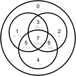 This example shows how to find all intersections of three sets. (This is related to Boolf.) from discretehelpers.set_part import SetPart