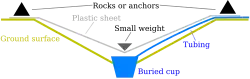 Knowing how to put together a solar still can prove to be a useful survival skill and could provide an important means of obtaining potable water in the event of a wilderness emergency. Nevertheless, under typical conditions makeshift solar stills rarely produce enough water for long-term survival, and the sweat expended in building one can easily exceed its daily output. Solar stills can extract water from moisture in the ground but to increase the amount of moisture available to a solar still, water (fresh or saline) can be added inside or along the edges of the still. Where no water sources are readily available, shredded vegetation, wet soil/sand, urine or covered faeces, can be used inside the pit. If only the natural soil moisture is used, the pit must eventually be moved as the productivity drops. To prevent losing moisture by taking apart the still to retrieve collected water a length of plastic tubing can be used to sip water as it accumulates.